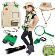 A nature exploration kit packed with binoculars, a compass, field notebook, and stickers. Encourages hands-on outdoor discovery and learning.